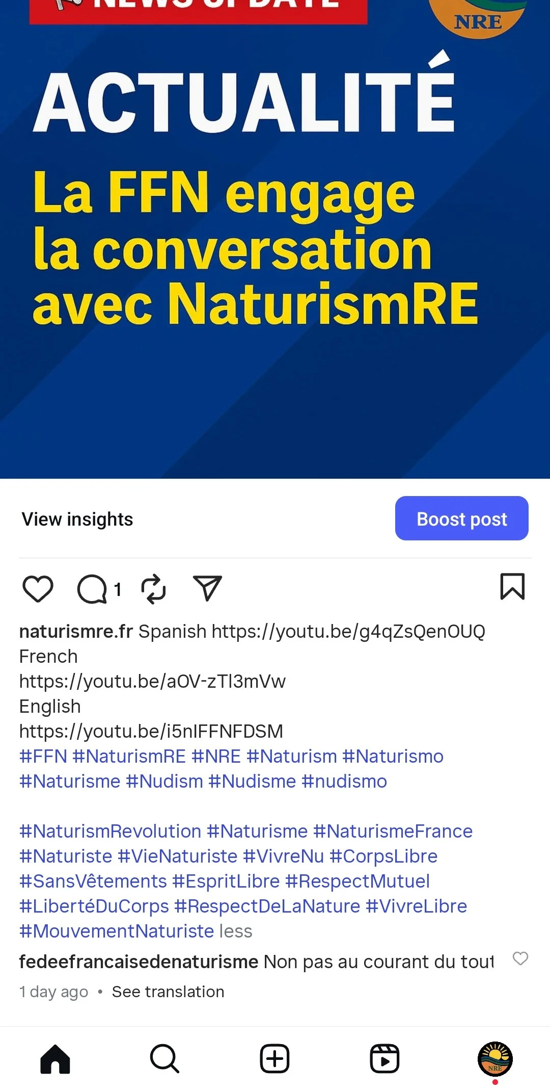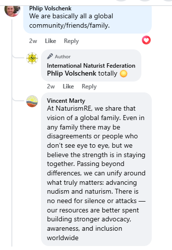 NaturismRE is a global initiative communicating through multilingual accounts. We initially reached out to naturist federations by email but received only silence. When FFN engaged, we welcomed the opportunity to open a professional, transparent dialogue about how to truly promote naturism and nudism.