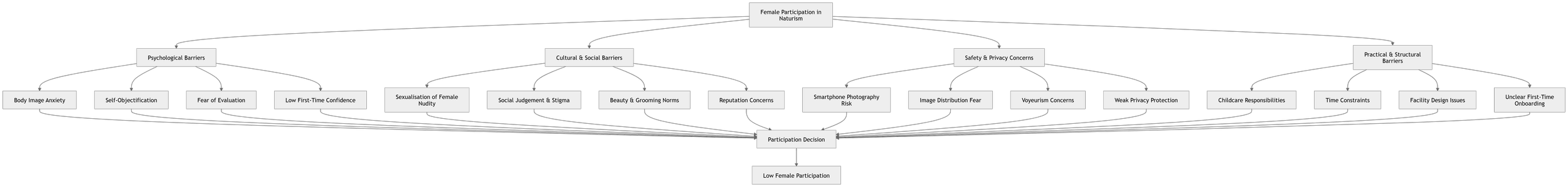 These barriers collectively influence the participation decision, leading to lower female representation in naturist environments.