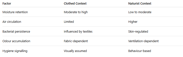 This perception raises a central question: whether body odour is inherently increased by nudity, or whether it is primarily influenced by clothing systems, environmental conditions, and behavioural factors.