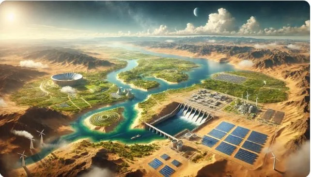 Undertake large-scale terraforming, including river redirection, seasonal rain catchment, dams, Atmospheric water generation catchment and desalination plants.