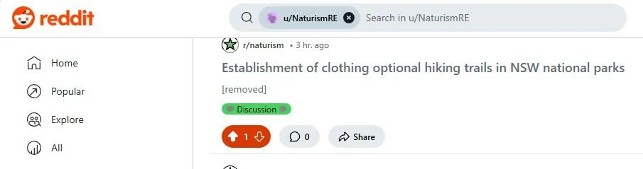"Establishment of Clothing-Optional Hiking Trails in NSW National Parks" – A proposal advocating for safe, inclusive outdoor spaces, removed despite its relevance to naturism.