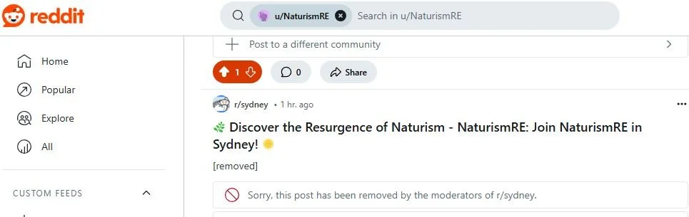"Discover the Resurgence of Naturism – NaturismRE: Join NaturismRE in Sydney!" – Removed even though it adhered to Reddit's posting guidelines.